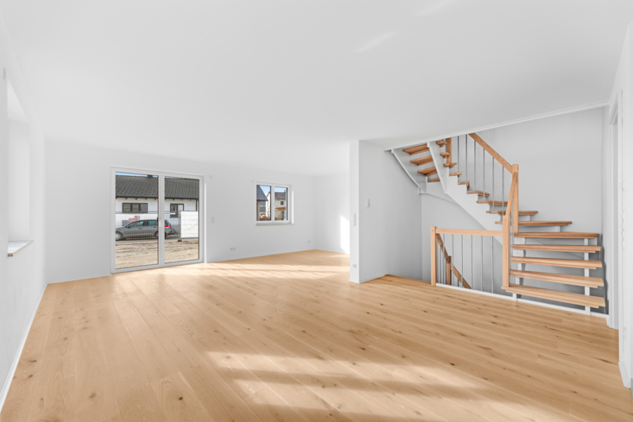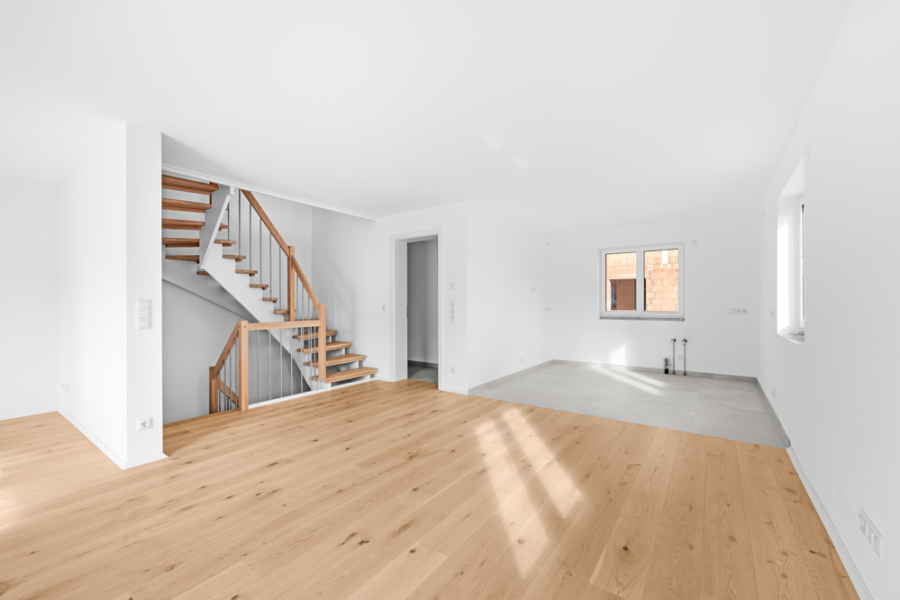 Die Eingangstür öffnet sich – und sofort spüren Sie es: Hier stimmt alles. Der einladende Eingangsbereich empfängt Sie herzlich und führt Sie direkt in das Herzstück des Hauses. Großzügig, lichtdurchflutet, lebendig. Die dreifach verglasten Fenster lassen das Tageslicht hereinströmen und schaffen eine Atmosphäre, in der man einfach aufatmet.