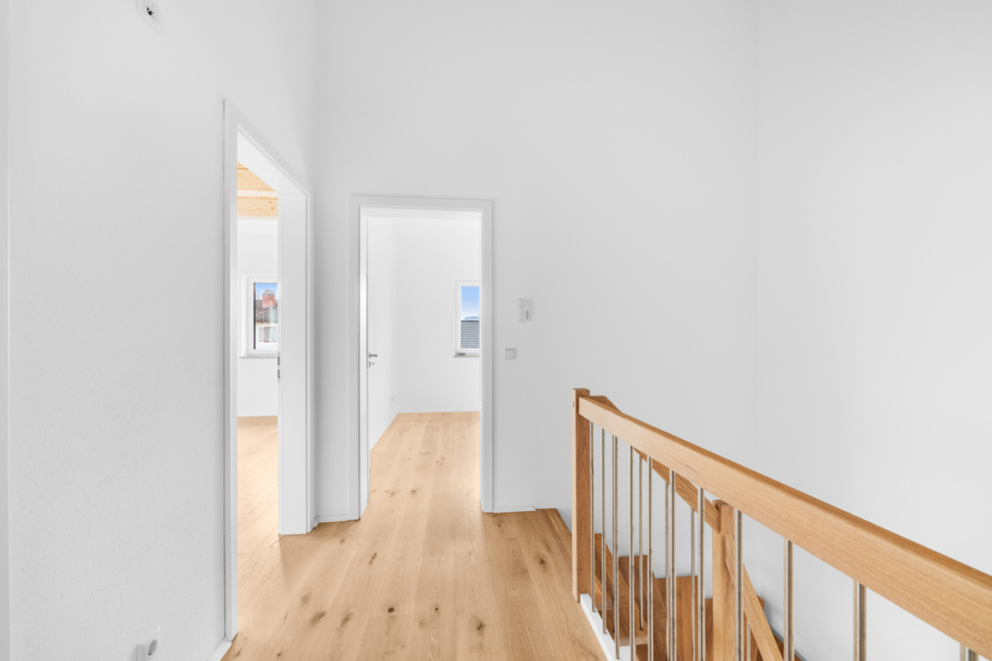 Obergeschoss: Drei geräumige Schlafzimmer warten darauf, von Ihnen gestaltet zu werden – als Kinderzimmer voller Abenteuer, als ruhiger Homeoffice-Rückzugsort oder als behagliches Gästezimmer. Das Badezimmer mit hochwertigen Materialien, modernen Armaturen und wohltuender Fußbodenheizung macht den Morgen zum kleinen Luxuserlebnis.
