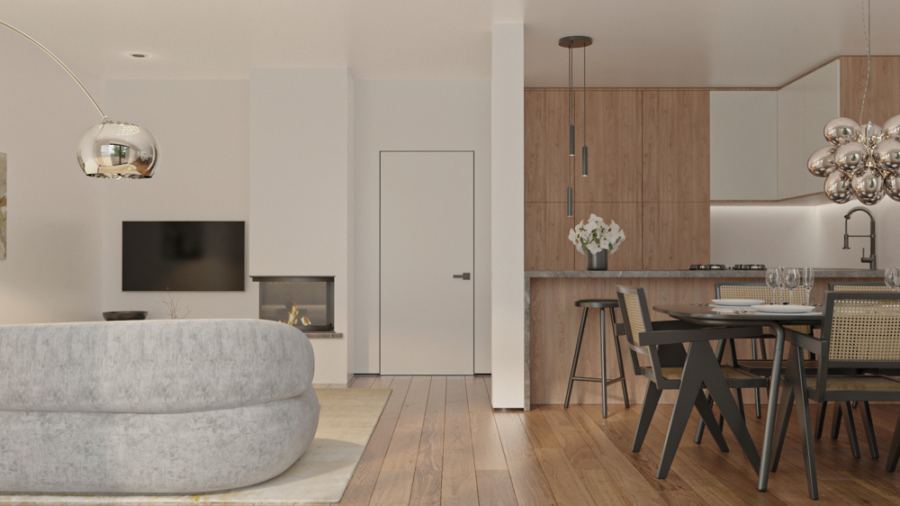 Der offen gestaltete Küchen-, Ess- und Wohnbereich bildet das Herzstück der Wohnung. Große, raumtiefe Fenster sorgen für viel Tageslicht und eine helle, freundliche Atmosphäre sowie einen fließenden Übergang zum Garten.