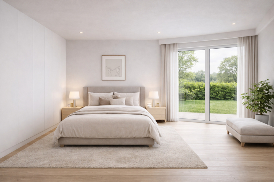 Auch das Schlafzimmer überzeugt mit einem angenehmen Blick ins Grüne und schafft eine ruhige, entspannte Wohnatmosphäre.