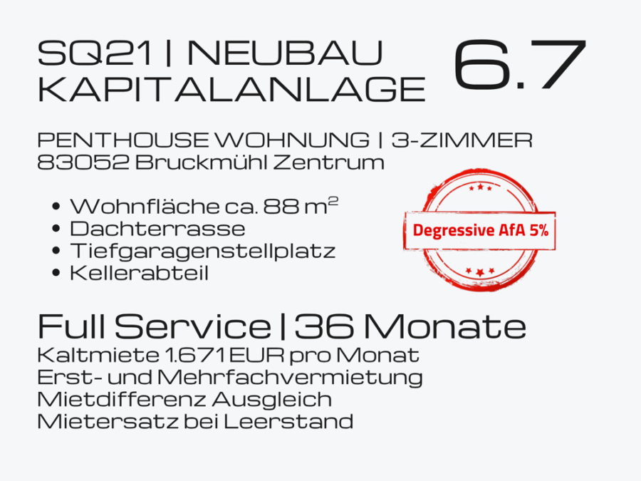 SQ21 NEUBAU | Kapitalanlage – Bruckmühl Zentrum, Penthouse, Dachterrasse, Tiefgarage, Aufzug, Keller