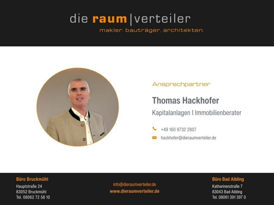 Herzlich willkommen bei der raumverteiler immobilien GmbH in Bruckmühl. Wir sind Ihr Premium Immobilienmakler, wenn es um die Beratung oder den Verkauf einer hochwertigen Immobilie in der Region von Rosenheim über Bad Aibling, Feldkirchen-Westerham bis nach München geht.